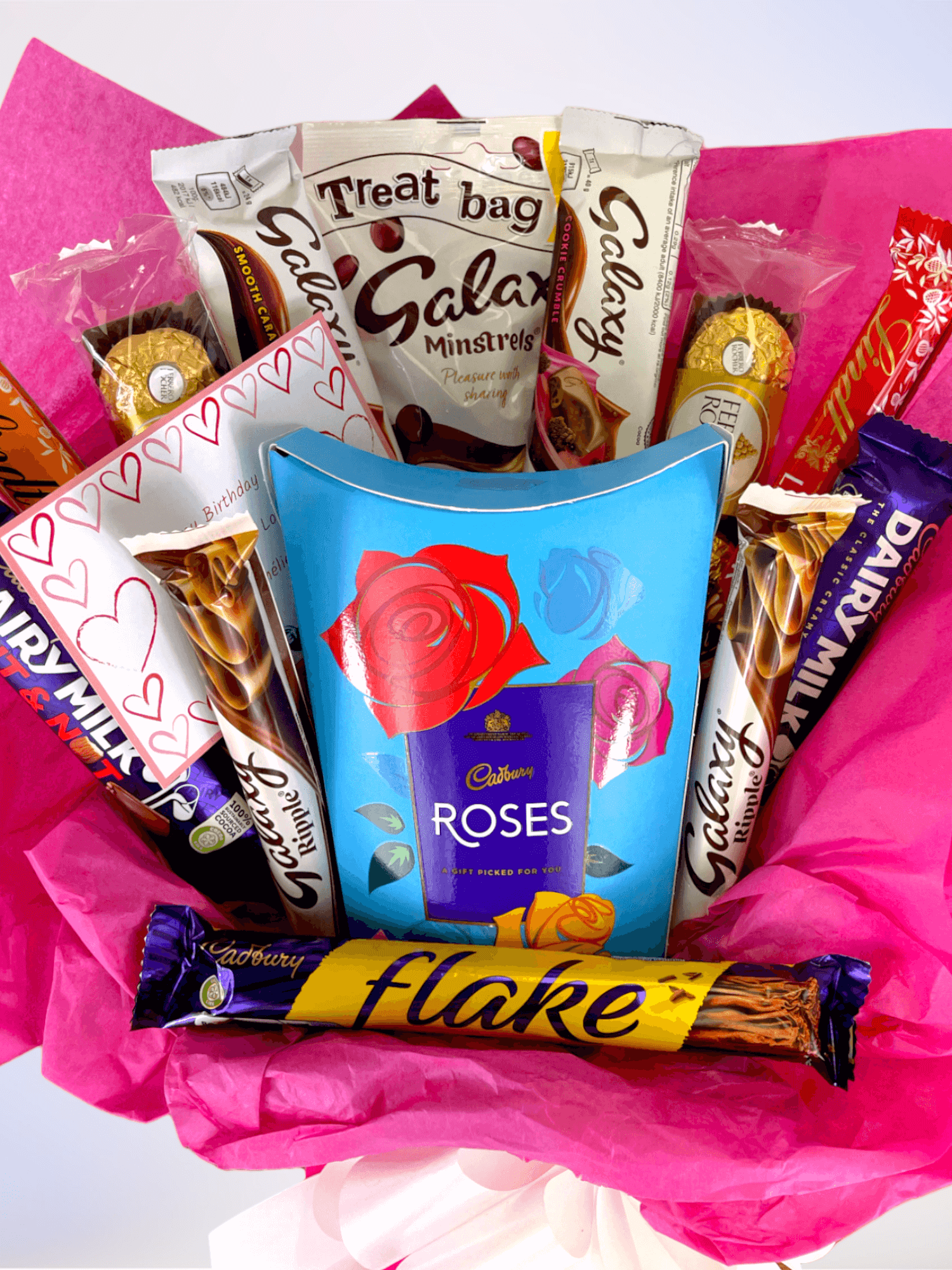 Ferrero Rocher 3 Pack x2, Lindt Lindor Milk Chocolate Bar, Lindt Lindor Orange Milk Chocolate Treat Bar, Roses 189g, Galaxy Cookie Crumble, Dairy Milk, Flake, Galaxy Ripple 33g x2, Galaxy Caramel, Dairy Milk Fruit & Nut, Galaxy Minstrels