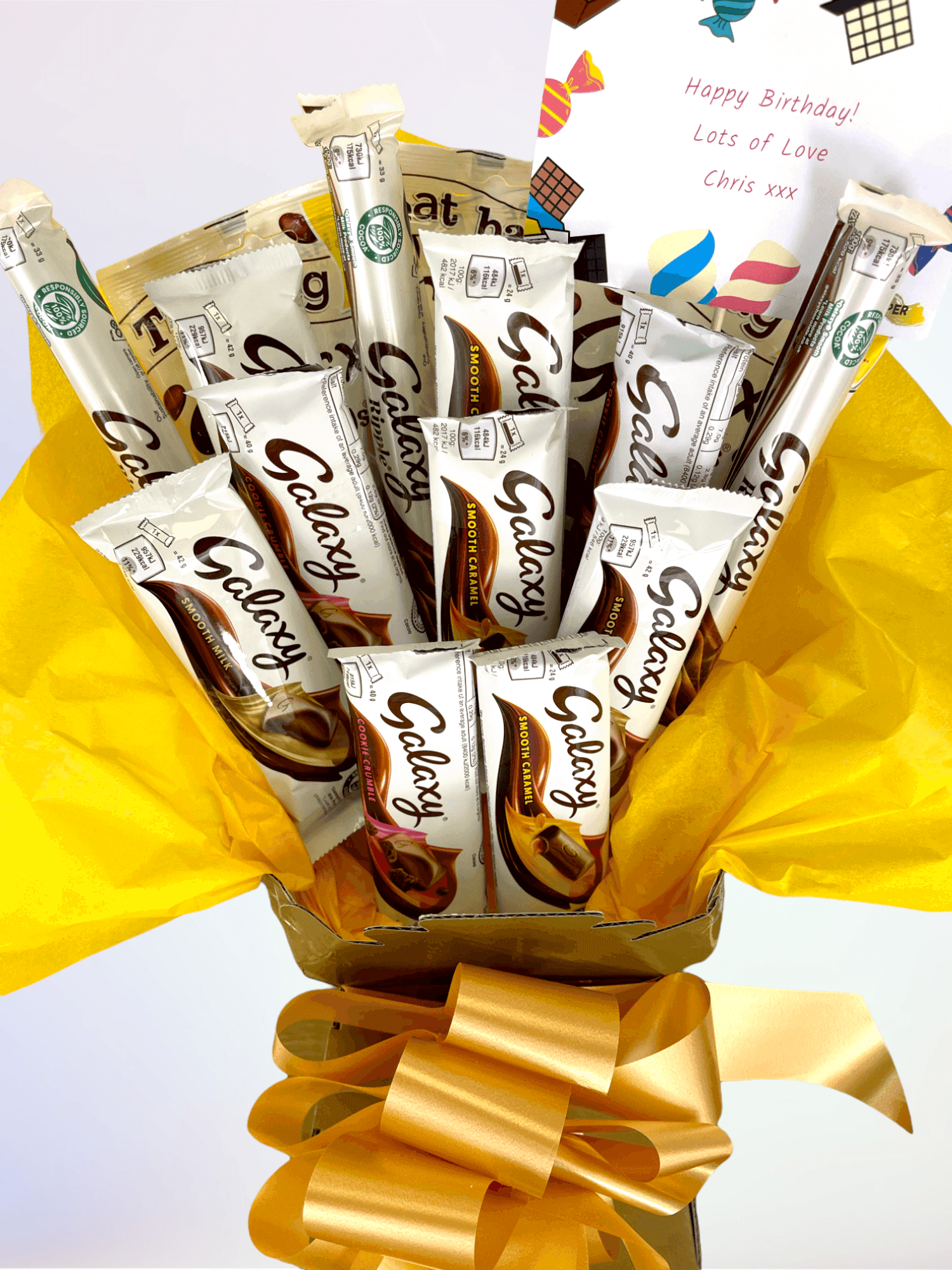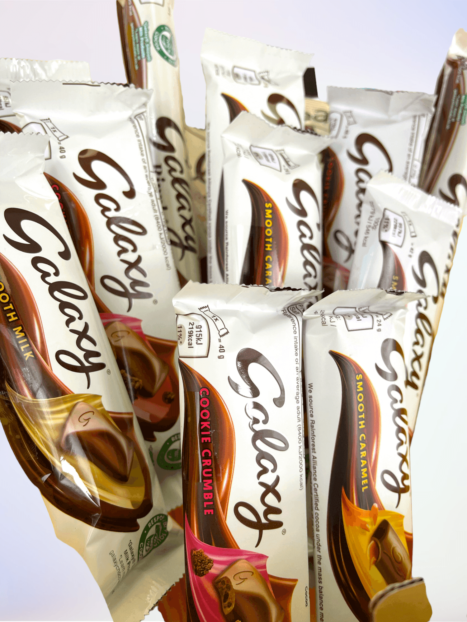 3 x Galaxy Milk, 3 x Galaxy Caramel, 3 x Galaxy Cookie Crumble, 3 x Galaxy Ripple, 3 x Galaxy Minstrel Bags